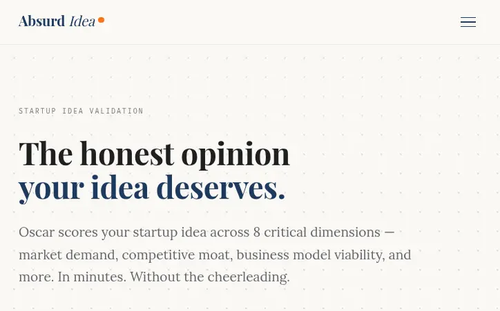 AbsurdIdea is a startup idea validation platform. You describe your idea in plain language — the problem, who you're solving it for, and how you plan to make money — and Oscar returns a scored analysis across eight dimensions, a clear verdict, and a prioritised action plan.