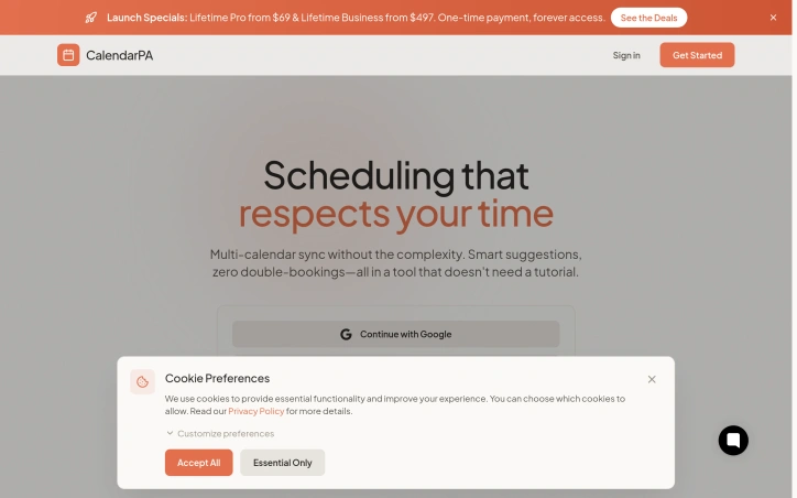 CalendarPA positions itself as a scheduler built for freelancers, coaches, and teams who want to stop juggling links, calendars, and burnout. At the center sits Ada, an AI assistant reachable by email, text, or chat; she books meetings for both sides without either participant ever seeing a booking link. Multi-calendar sync from Google or Microsoft runs in the background, helping to prevent double bookings while keeping the interface simple enough to skip tutorials.