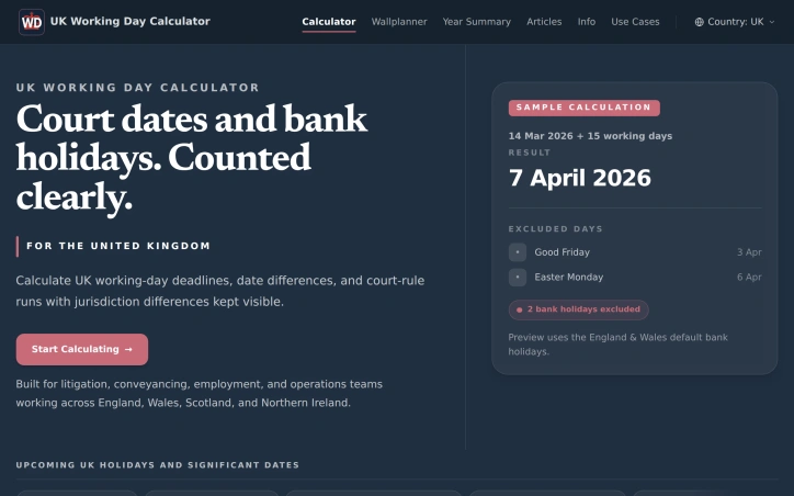 Calculate UK working days, date differences, and court-rule deadlines for England, Wales, Scotland, and Northern Ireland.